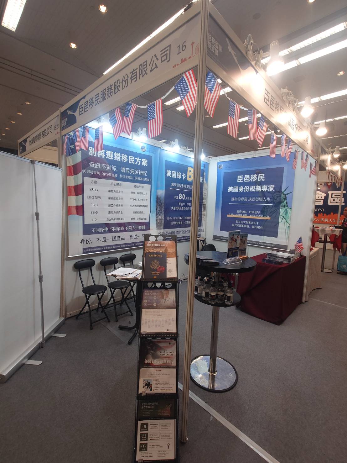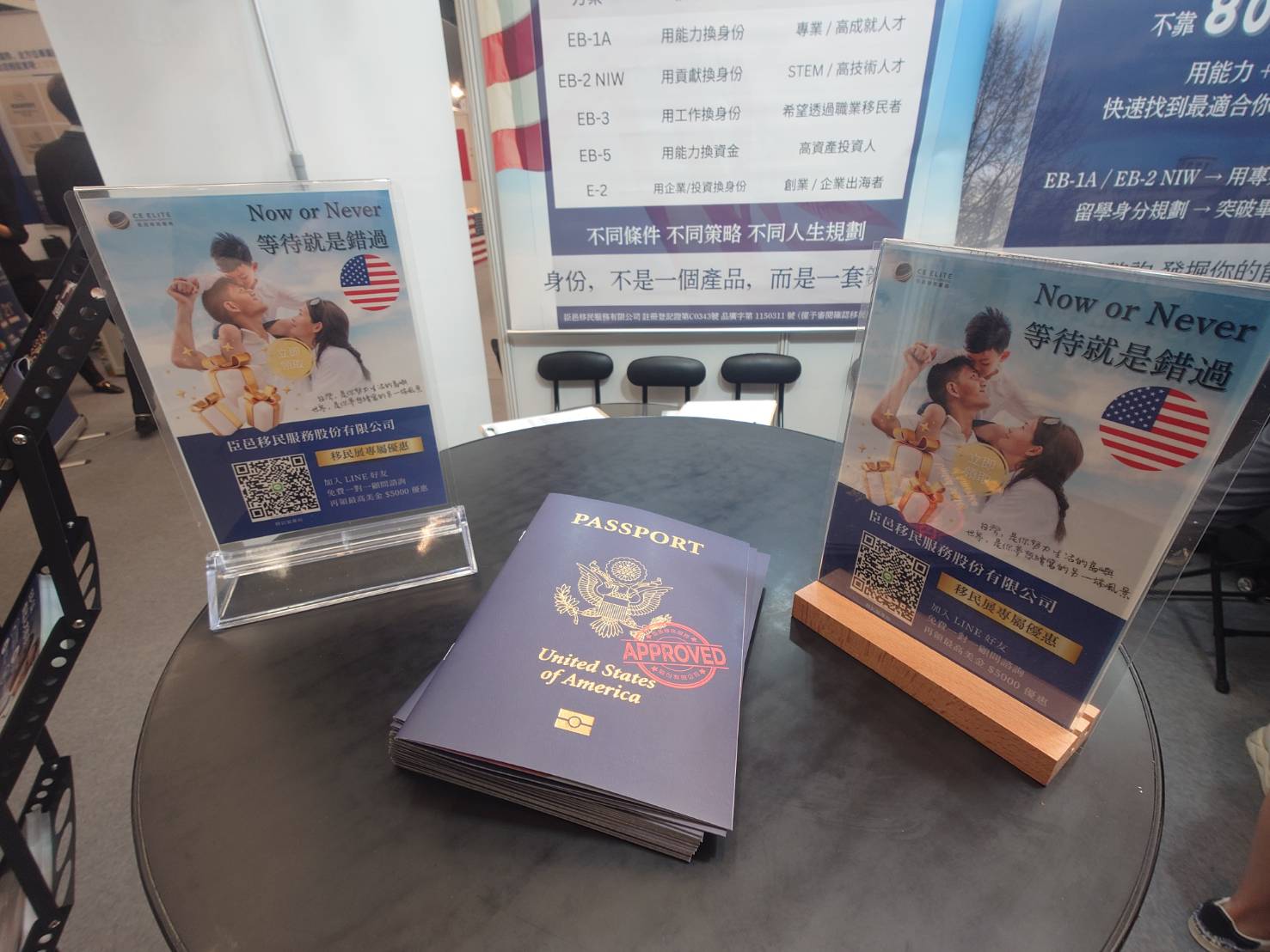- 護照示意: 現場展示的「Passport Approved」象徵著我們過去協助無數客戶圓夢的豐碩成果,以及美國移民路線的可行性方針。
