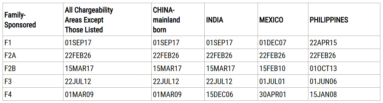 | F1美國公民21歲以上成年未婚子女 | 2017年9月1日 | 2017年9月1日 | 無變化 |