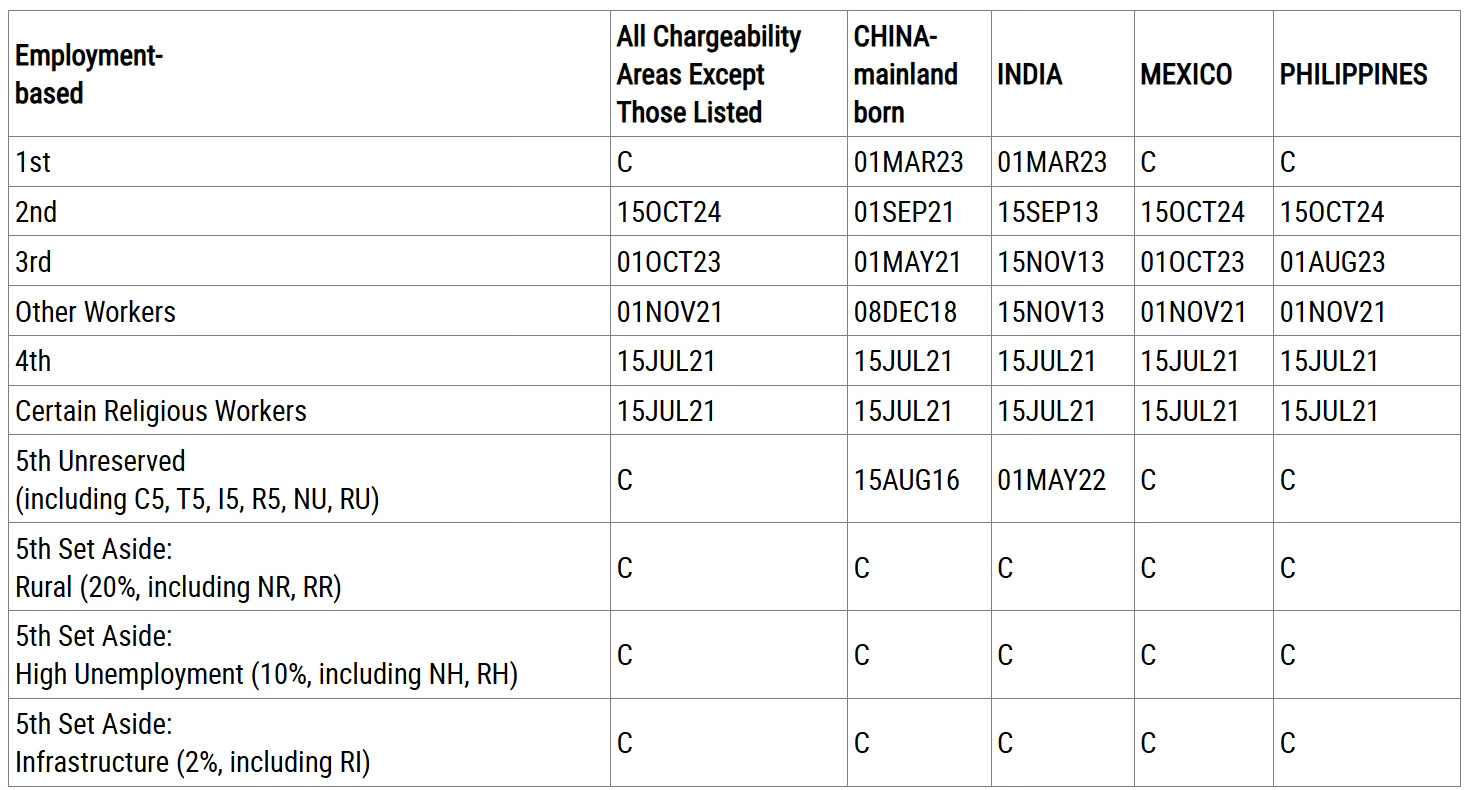 | EB-2高等學位或特殊能力人才 | 2024年10月15日 | 無排期 | 無排期 |